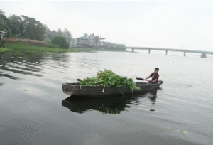 কচুরিপানার ডগা সংগ্রহ করে ডিঙিনৌকায় গন্তব্যে চলা
