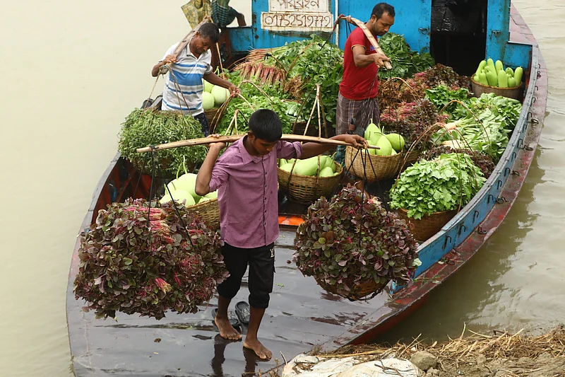 কচুরিপানার ডগা সংগ্রহ করে ডিঙিনৌকায় গন্তব্যে চলা
